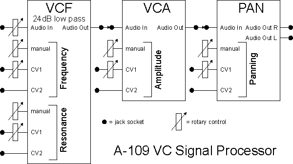 Das Modul A-109 ist ein spannungsgesteuerter Audio-Signalprozessor, der auf folgenden Einheiten besteht: