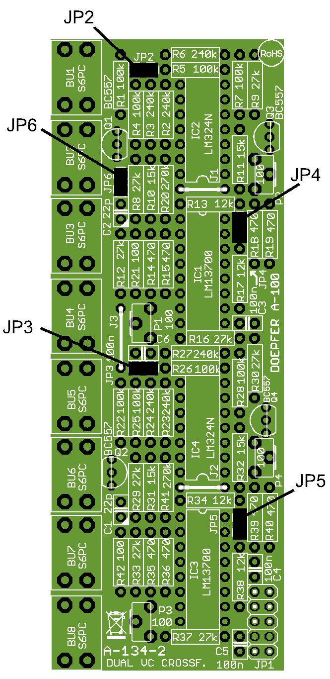 Module A-134-2 contains two identical voltage controlled crossfader units. Each unit has two voltage controlled amplifiers (VCAs) with opposite control behaviour available. The outputs of the two VCAs are mixed together to obtain a common output. The behaviour of the control voltage inputs can be chosen with an internal jumper: Symmetrical mode: If the corresponding jumper is not set both VCAs of the crossfader have the same 50% amplification with zero CV. If the applied CV becomes positive the amplification of VCA1 decreases and those of VCA2 increases in the same way. A negative CV has the opposite result. The CV voltage range to obtain the maximum/minimum positions of the crossfader is about -2.5....+2.5V. This mode is useful for bidirectional (i.e. positive and negative) control voltages, for example LFO or joy stick (adjusted to 0V CV in center position). Asymmetrical mode: If the corresponding jumper is set VCA2 is fully closed and VCA1 has full 100% amplification with zero CV. If the applied CV becomes positive the amplification of VCA1 decreases and those of VCA2 increases in the same way. The CV voltage range to obtain the maximum/minimum positions of the crossfader is about 0....+5V. A negative CV has no function in this mode. This mode is useful for unidirectional (i.e. only positive) control voltages, for example ADSR, ribbon controller or Theremin control voltage. The CV input of the upper unit (CV1) is normalled to the CV input of the lower unit (CV2). I.e. if no plug is inserted to CV2 the CV input of the upper unit (CV1) also controls the lower unit. The second signal input of the upper unit (In1B) is normalled to the first signal input of the lower unit (In2A). I.e. if no plug is inserted into In2A the signal In1B is used as the first signal input of the second unit. As the inputs and outputs are DC coupled the module can be used for both audio and control voltage signal processing. The module can be modified to have only one common output available, i.e. output 1 and output 2 are mixed together and appear at the Out 2 socket. With this modification the module can be used in combination with the Joy Stick module A-174 as a two-dimensional crossfader, i.e. four signals are mixed to one output with the joy stick position defining the relation between the signals. In this application Out 1 has no function. Both units of the A-134-2 have to be set to symmetrical mode: