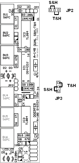 version). The following document shows the positions and functions of the jumpers and internal normalling options of the module:A148_jumper_and_normalling.pdf Technical note: The S&H/T&H function is realized by pure analog circuitry (electronic switch followed by a holding capacitor and buffer). Consequently the output voltage drifts a bit in the holding state because the capacitor is discharged by parasitic resistors. The typical drift we measured is about 30 mV/minute and depends also upon environmental conditions like humidity or temperature. For the storage of control voltages over a long time used to control the pitch of a VCO the module is suitable to only a limited extent. |