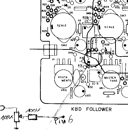 Bei Verwendung eines dieser Eingänge können MS20 (MS10)auch mit dem MCV24 im Volt/Oktave Modus angesteuert werden. Der 'kleine' Nachteil ist hierbei allenfalls, daß nunmehr diese Buchse nicht mehr für Modulationen benutzt werden kann und der sehr unpräzise und oft 'wackelige' Abschwächungsregel, mit dem eine exakte und vor allem dauerhafte V/Okt.Justierung manchmal zu einem kleinen Geduldsspiel werden kann. |