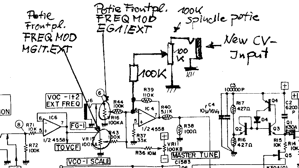 Schaltplan mit Vorschlag für Modifikation mit zusätzlicher CV-In-Buchse.