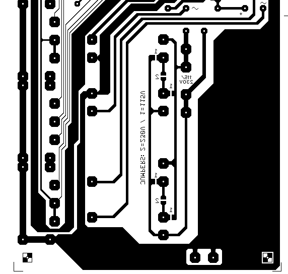 Vor dem Einbau der Platine in das Gehäuse müssen eventuell auf der Platinenunterseitze überstehende Drähte gekürzt werden, da der Abstand zwischen Platine und Gehäuseboden nur 5 mm beträgt. Insbesondere die 220V führenden Bauteiledrähte unter den beiden Trafos müssen soweit als möglich gekürzt werden, damit der Abstand zum Gehäuse möglichst groß ist. Zusätzlich kann der Gehäuseboden unter den 220V führenden Leiterbahnen mit einem isolierenden Material beklebt werden (z.B. unbeschichetes Platinenmaterial mit doppelseitigem Klebeband, dickes Gewebe-Isolierband, Gaffa-Tape o.ä.).