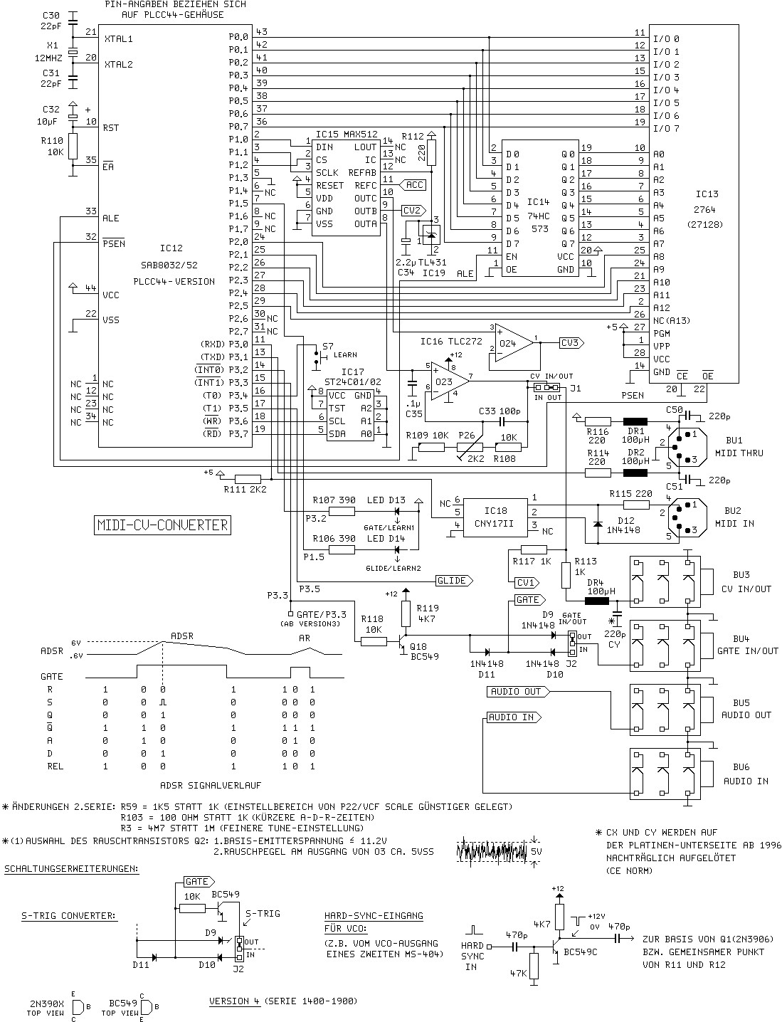 Der Gate-Ausgang (BU4, Jumper J2 in Stellung "Out") ist ein Spannungsausgang, d.h. Taste gedrückt ca.+4V, Taste nicht gedrückt 0V. Soll über den Gate-Ausgang ein Synthesizer mit S-Trigger angesteuert werden (z.B. Moog), so ist eine kleine Zusatzschaltung aus einem Widerstand (ca. 10k) und einem npn-Transistor (z.B. BC547, BC549, 2N3904) erforderlich, die aus dem Spannungstrigger einen S-Trigger macht (siehe Skizze in der unteren Hälfte des Schaltplanes/2.Seite).