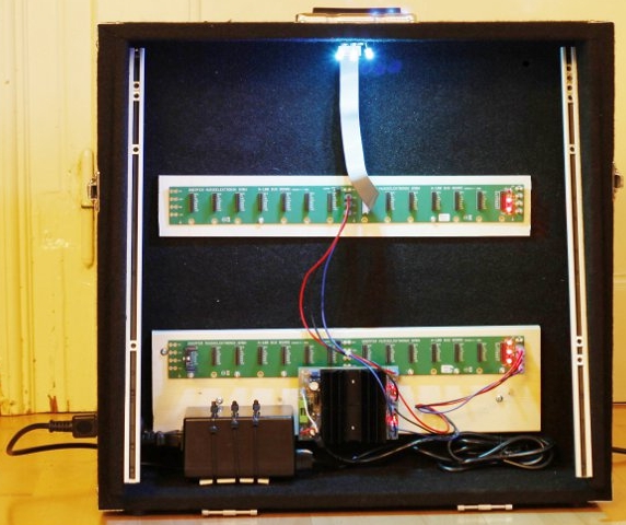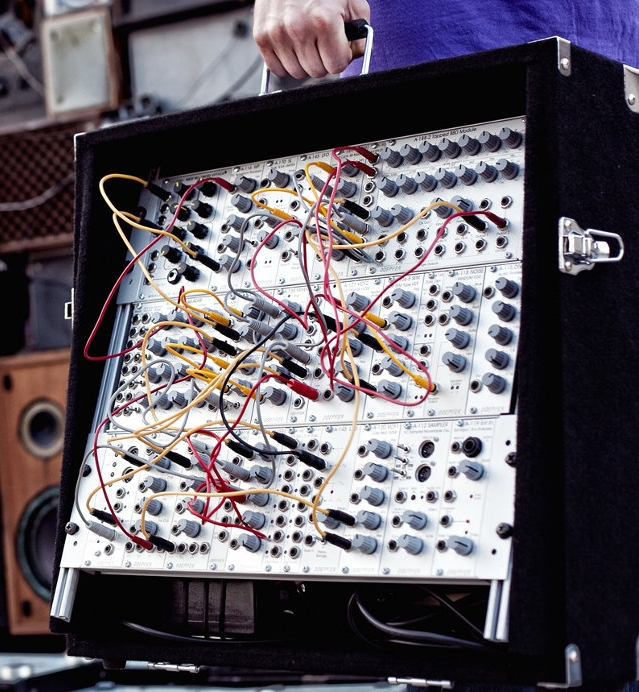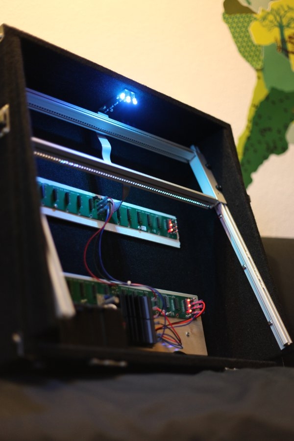 Monobot's comment: I packed my doepfer modular system into a suitcase, primarily designed for mixing desks. The suitcase has space for three 19" wide rows of modules. I used the A-100 DIY Kit #1 for this project with two additional 19" rails. All rails are attached to the suitcase with custom 3U rack ears from www.schneidersladen.de. I also added some selfmade LED lighting at the, top to be able to use the suitcase at places with poor lighting, like on stage. You can find my work and my music on: http://monomodder.blogspot.de and http://soundcloud.com/monobot. |