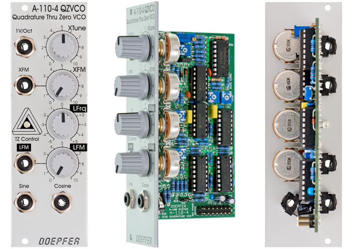 A-110-4 is a so-called Thru Zero Quadrature VCO. The term "quadrature" means in this connection that the oscillator outputs sine and cosine waveforms simultaneously. The term "Thru-Zero" means that even "negative" frequencies are generated. But this a bit a misleading term as negative frequencies do not really exist. "Negative" means in this connection simply that the sine/cosine waves will stop when the linear control voltage reaches 0V and continue with the opposite direction as the linear control voltage becomes negative and vice versa. The module has two control sections: linear and a exponential. The exponential section consists of the XTune control, the 1V/Oct input and the XFM input with the corresponding attenuator XFM. The exponential control voltage is the sum of these three voltages. The linear section consists of the LFrq control and the LFM input with the corresponding attenuator LFM. The linear control voltage is the sum of these two voltages. A dual color LED is used to display the polarity of the linear control voltage (red = positive, yellow = negative). The pitch of the sine/cosine outputs is determined by the control voltages of both sections. The linear section is used to control the pitch in a linear manner. When the LFrq control (LFrq means Linear Frequency Control) is fully CW the module works like a normal Quadrature VCO (e.g. like the A-143-9) and the LED lights red (red = positive). The pitch is then controlled by the exponential section with the manual Tune control XTune and the exponential frequency control inputs 1V/Oct and XFM. 1V/Oct is used to control the pitch by a 1V/Oct CV source (e.g. sequencer or Midi/USB-to-CV interface). XFM is used to apply an exponential frequency modulation with adjustable depth (e.g. from an LFO or another VCO). As the LFrq control is turned counterclockwise starting from the fully CW position the frequency is lowered in a linear manner until the sine/cosine waves (nearly) stops at the center position of LFrq (provided that no LFM signal is present). As the LFrq control is moved from the center towards the CCW position the wave starts again but into reverse direction and the LED turns yellow. When the fully CCW position of LFrq is reached the module works again like a normal Quadrature VCO. But much more exciting is the usage of the LFM input to modify the linear control voltage by an external control voltage (typically another sine VCO like a second A-110-4 - but even normal VCOs can be used). Linear modulation by another oscillator using the thru zero feature generates audio spectra than cannot be obtained from an oscillator without the thru zero function. The reason is that a "normal" VCO will simply stop as the linear control voltage becomes zero or negative. But a thru zero VCO will start again with "negative" frequencies as the the linear control voltage becomes negative. The main advantage of the A-110-4 compared to other Thru Zero VCOs is that the design uses a sine/cosine core. The sine/cosine waves are not derived from other waveforms (e.g. sawtooth or triangle) by means of waveshaping. Rather the sine and cosine waves are the core of the VCO which results in very pure waves with a minimum of distortion and overtones. The output level is about 10Vpp (please refer to the note at the bottom for the output level of older versions). Important note: Please remove the bus jumper (JP3 "BUS CV") if no CV transmitter is installed on the same bus (e.g. a Midi/USB-to-CV interface A-190-x or a bus access module A-185-x). The A-110-4 applies a small voltage with high impedance (100k) to the CV line of the bus when the bus CV jumper is installed. This may affect other modules that pick-up CV from the bus (e.g. other VCOs). As soon as a CV transmitter is installed on the same bus the high impedance voltage of the A-110-4 is overwritten and no problem occurs ! Additional technical notes: The document A110_4_trimming_potentiometers.pdf explains the functions of the trimming potentiometers. The document is planned only for experienced users ! Please do not change the settings of the trimming potentiometers unless you are sure that you want to change certain settings. Modules which are returned with (mis-)adjusted trimming potentiometers cannot be treated as case of warranty ! In the factory the module is ajusted for these frequencies (with LFrq fully CW and XTune in the according position so that an external 5.00V control voltage generates 1024 Hz, i.e. the +5V CV is the reference setting with 0Hz error):
