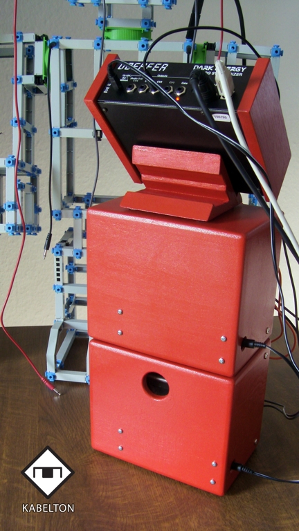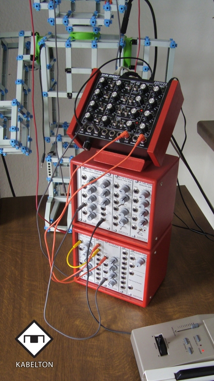 | Der Aufbau basiert auf einem Dark Energy und zwei A-100-Mini-Cases mit eingebauten A-100-Modulen. Im unteren Mini-Case ist ein Federhall-Modul A-199 eingebaut, dessen Federn von außen über ein großes Loch zugänglich sind (z.B. um dagegen zu klopfen oder diese zu zupfen). Der Metallrahmen des Federhall-Systems wurde vom Kunden etwas gekürzt, damit er in das Mini-Case passt. | The assembly is based on a Dark Energy and two A-100 miniature cases with built-in A-100 modules. The lower miniature case contains a spring reverb module A-199. The springs are accessible via a hole (e.g. to knock or pluck the springs from outside). The frame of the spring reverb was shortened by the customer so that it fits into the miniature case. |