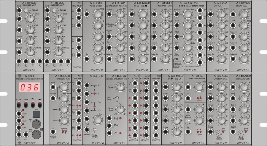 nahezu identisch mit dem Basis-System 1, es ist jedoch mit dem MIDI-Interface A-190-4 ausgestattet und einer der beiden Standard-LFOs A-145 ist durch