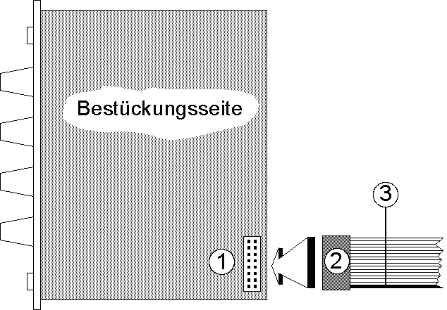 Verbinden Sie nun das freie Ende des Flachkabels (s. 2 in Abb. 2) mit einem freien Steckplatz auf der Busplatine (s. 1 in Abb. 2).