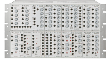 Die Module sind standardmäßig in einem Rack mit 6 Höheneinheiten (6HE) mit eingebautem Netzteil und Busplatinen untergebracht. Auf Wunsch kann das Basissystem 1 auch in jedes andere A-100-Gehäuse eingebaut werden, wobei ggf. freie Höheneinheiten mit Blindplatten verschlossen werden. Die aktuellen Preise für die verschiedenen Gehäusevarianten finden Sie in der Gesamtpreisliste im Abschnitt A-100. |