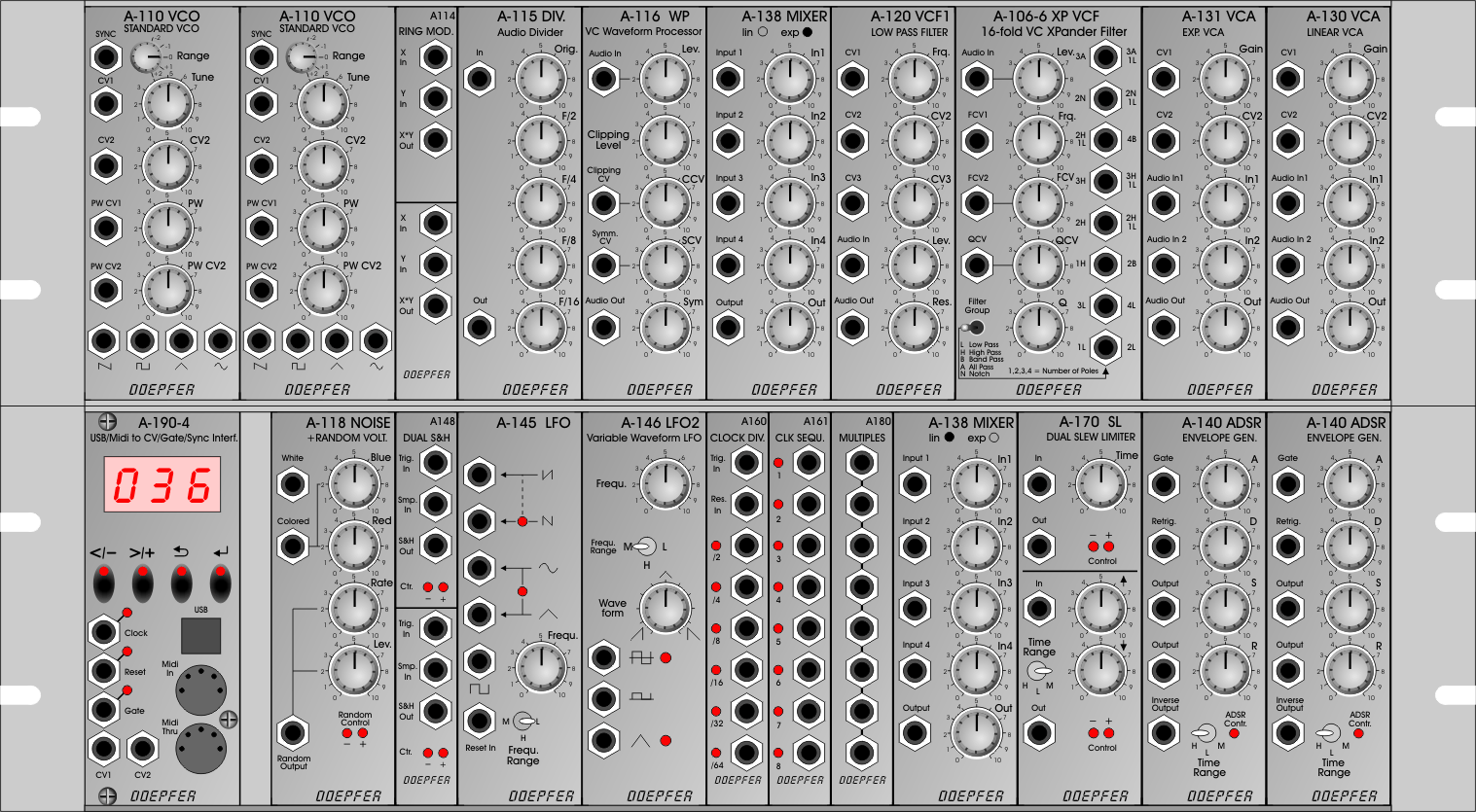 ist eine Rückbesinnung auf Dieter Doepfer's ursprüngliche Vision der analogen Modularsynthese. Einzelne Module können über die frontseitigen Audio- und Steuerspannungsanschlüsse immer wieder neu miteinander verbunden und in nahezu unendlichen Kombinationen eingesetzt werden.