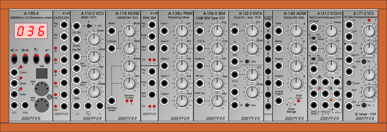 Das Mini-System A-100BSM stellt eine Minimalkonfiguration des A-100 dar. Folgende Module befinden sich im Mini-System: