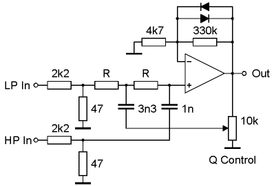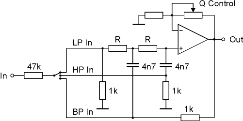 Nyle A. Steiner published a modification of this circuit in the magazine Electronic Design (issue 25, December 1974, page 96 ff). He extended the circuit by three 1k resistors and a three position switch that was used to feed the audio input signal into one of three different sections of the circuit. The three different inputs lead to different filter types (low pass / LP, band pass / BP, high pass / HP) with a common output for all filter types. We cannot confirm Nyle A. Steiner's statement after what the resonance resp. Q remains essentially the same as the frequency is changed. Rather the resonance increases clearly as the frequency becomes smaller. We discovered this behaviour in the "real" circuit as well as in the PSpice simulation of Nyle A. Steiner's circuit. For the Sallen&Key filter Q is indeed nearly independent of the frequency. But the introduction of the three 1k resistors leads to a frequency depending resonance. The Q/f dependence can be lowered if the 1k resistors are made smaller (e.g. 100 Ohm). But in this case the output level becomes very small and requires an additional output amplifier to compensate the attenuation.