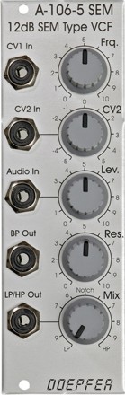 Das Modul A-106-5 ist ein 12dB-Multimode-Filter, in dem die Schaltung des SEM-Moduls zum Einsatz kommt. Das Filter verfügt über einen Tiefpass, Bandpass und Hochpass, wobei Tief- und Hochpass ein Mischausgang zur Verfügung steht. Mittels eines Drehreglers kann dieser Ausgang stufenlos zwischen Tiefpass über Bandsperre (Notch) zu Hochpass umgeblendet werden. Der Bandpass steht als separater Ausgang zur Verfügung. Im Gegensatz zu den meisten anderen Filtern des A-100 ermöglicht der A-124 keine Selbstoszillation. Das Modul kann mit den üblichen Signalpegeln des A-100 (z.B. VCO) übersteuert werden, wobei etwa ab der Mittelstellung des Level-Reglers die Verzerrungen einsetzen. Eingänge: Audio In, CV2 In mit