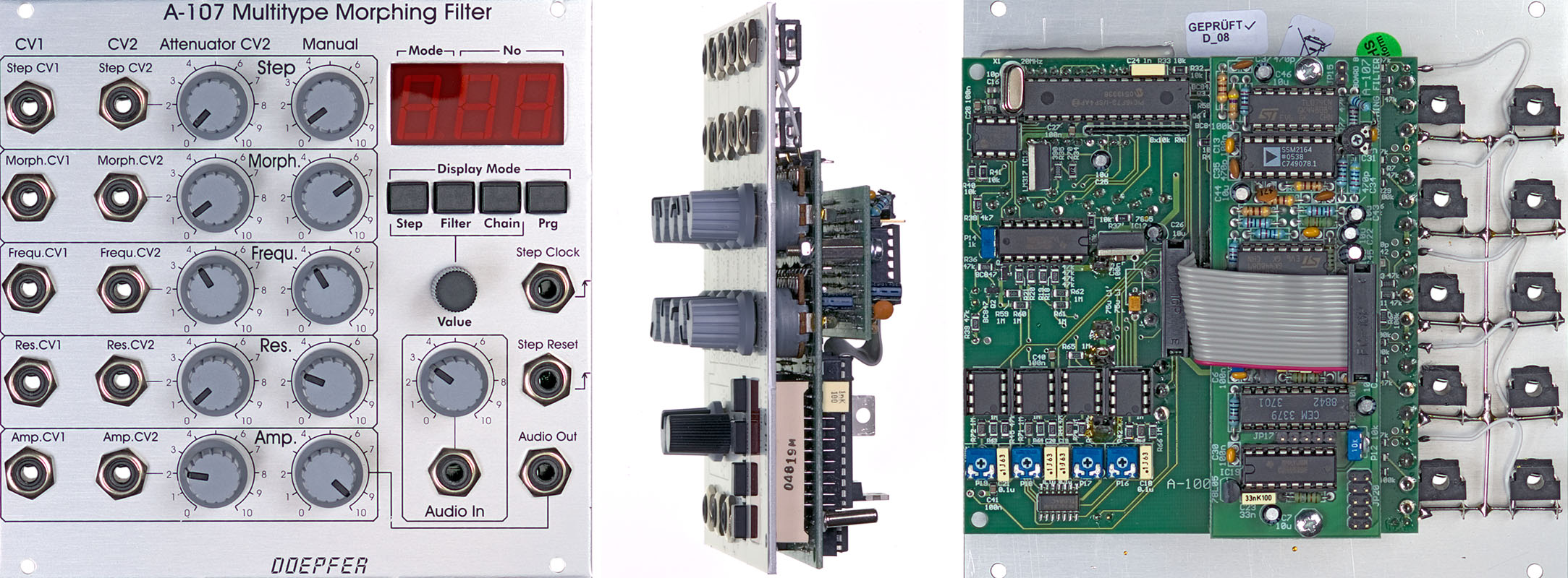 one CV input with attenuator and one CV input without attenuator. On top of it a final VCA is available (even with manual control, CV input with attenuator and CV input without attenuator). The filter design is 100% analog (CEM filter chip). Only the morphing control and memory managing is carried out by a microcontroller. Remark: Because of technical reasons the transition between the two filter groups (1...18, resp. 19...36) cannot be carried out soft as capacitors have to be switched. Soft transition (i.e. morphing) is possible only within the filter group (i..e. within the filters 1...18 or 19...36). Switching between filters causes a "click" if the filters are from different groups. For more detailed information please look at the