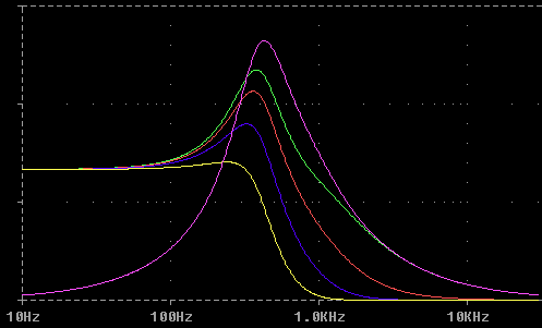 Module A-108 is a completely new voltage-controlled low pass pass filter based on the well-known transistor ladder (Moog ladder). The module has internally an 8 stage low pass filter with different slopes available: 6, 12, 18, 24, 30, 36, 42 and 48 dB per octave. In addition it features an band pass output (i.e. band pass with transistor ladder). In the factory the 4 low pass outputs of the A-108 are internally connected to the filter stages 6, 12, 24 and 48dB. From our first A-108 audio tests this seems to be the best output combination as these outputs generate audible different sounds. E.g. the audible difference between the 48dB and 42dB or between 42dB and 36dB is very little. But if desired any of the filter stages can be connected to one of the outputs. Remark: Only 4 output stages are available as this seems to be sufficient from our experiences. In the factory the out stages are connected to the filter stages with 6, 12, 24 and 48 dB slope. By changing the internal connections (jumpers or wires) each of the filter stages can be used but only four at a time. Even a multi-way switch could be used but from our results the factory setting (6/12/24/48dB) is the best combination for musical applications. More details below (after the frequency response pictures). Resonance (Emphasis or Q ) can be adjusted manually right up to self-oscillation, in which case the filter will behave like a sine wave oscillator. The A-108 features an external feedback input that enables the insertion of additinal modules into the feedback path (e.g. VCA for voltage controlled resonance or phaser/frequency shifter for phase/frequency shifting effects). The socket is normalized and internally connected to the 48dB low pass output if no cable is inserted into the feedback socket. The frequency can be adjusted manually, or by voltage control. Three CV inputs (CV1, CV2, CV3) are available. CV2 and CV3 are equipped with attenuators. The filter audio input is very sensitive so that distortion - if desired - is possible even with normal A-100 levels (e.g. VCO output). Self oscillation will break off at high distortion levels as the internal feedback signal is drown out by the distorted audio signal. This feature may intentionally be used to create new sounds. In combination with the Voltage Controlled Mixer A-135 and the Morphing Controller A-144 a filter with voltage controlled slope can be realized (i.e. controlling the slope from 6dB to 48dB via CV). The sketches below show the frequency response of the five filter outputs at three different resonance settings. The English user's manual is available on our web site as pdf file: A108_man.pdf.