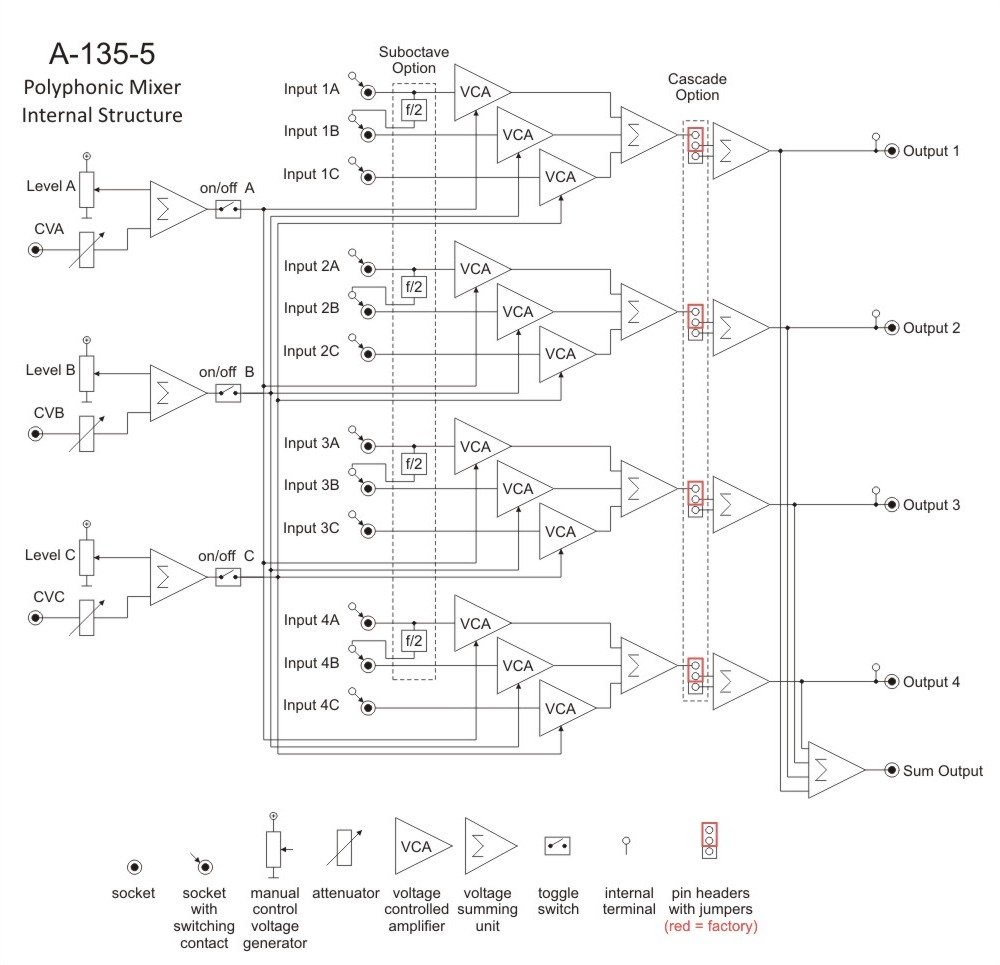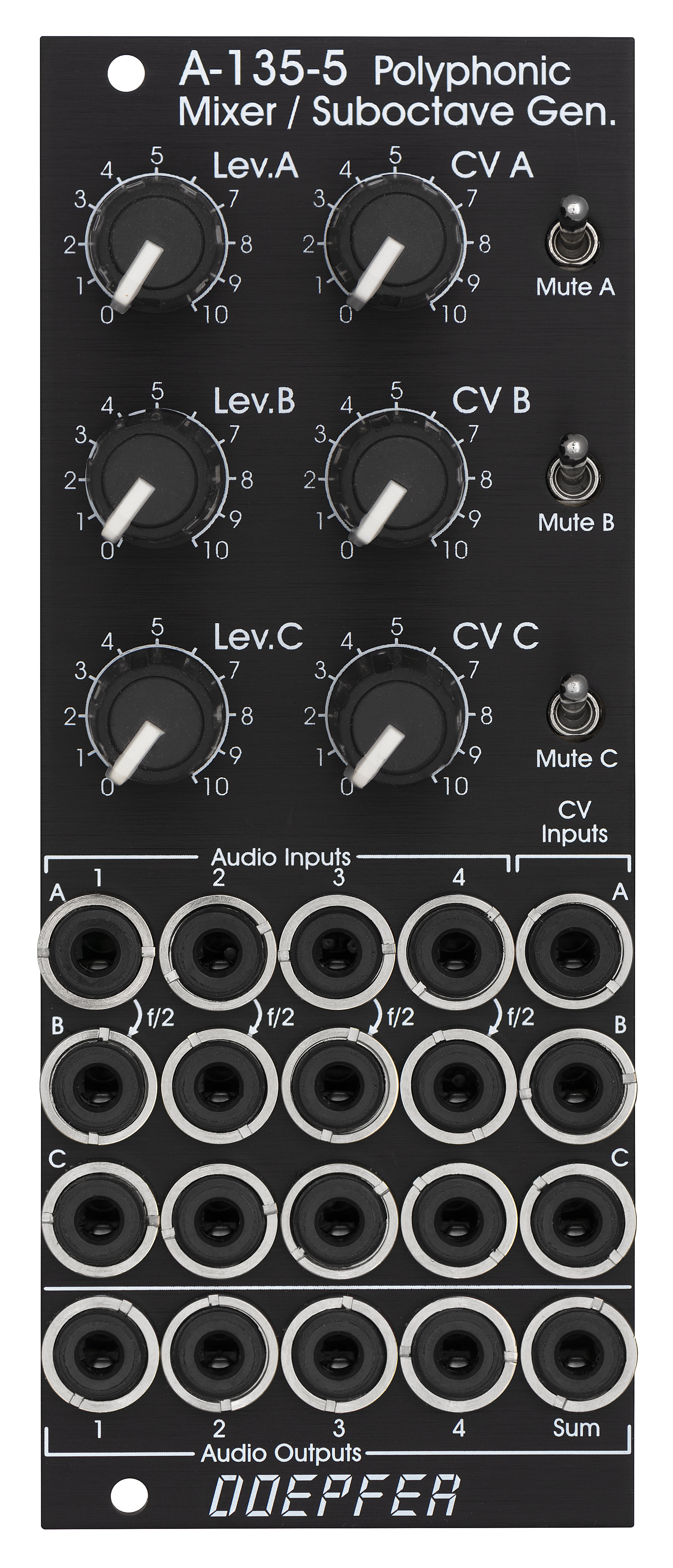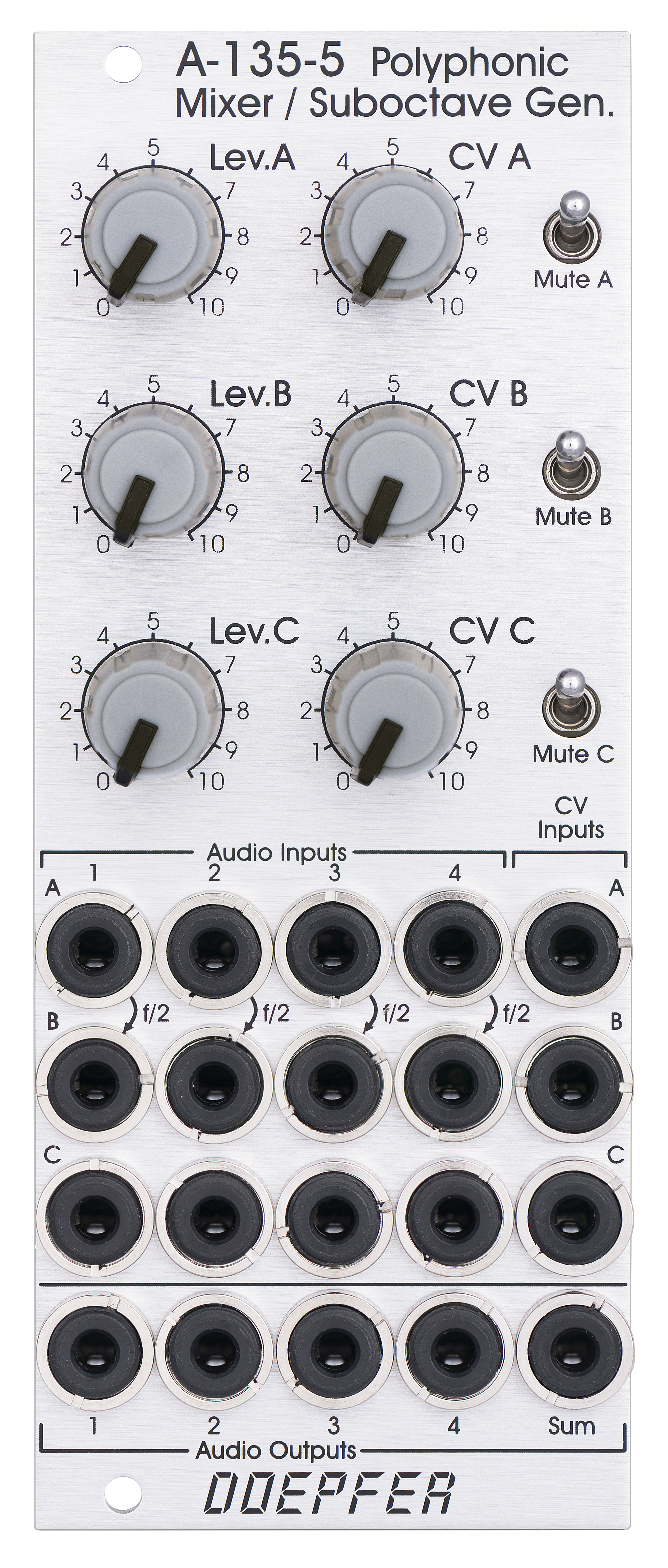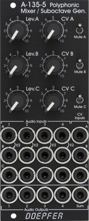 A-135-5 Polyphonic Voltage Controlled Mixer / Suboctave Generator / Voltage Controlled Quadrophonic Mixer |