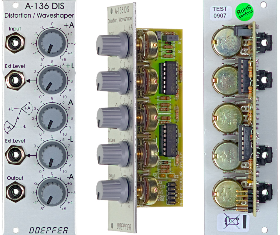 A-136 ist ein Verzerrungs- und Wavehaping-Modul mit umfangreichen Einstellparametern. Das Eingangssignal (Audio oder Steuerspannung) wird intern im Modul zunächst in 3 getrennte Signalwege aufgeteilt, die am Ausgang mit einstellbarer Verstärkung (positiv/negativ) wieder zusammen gemischt werden: