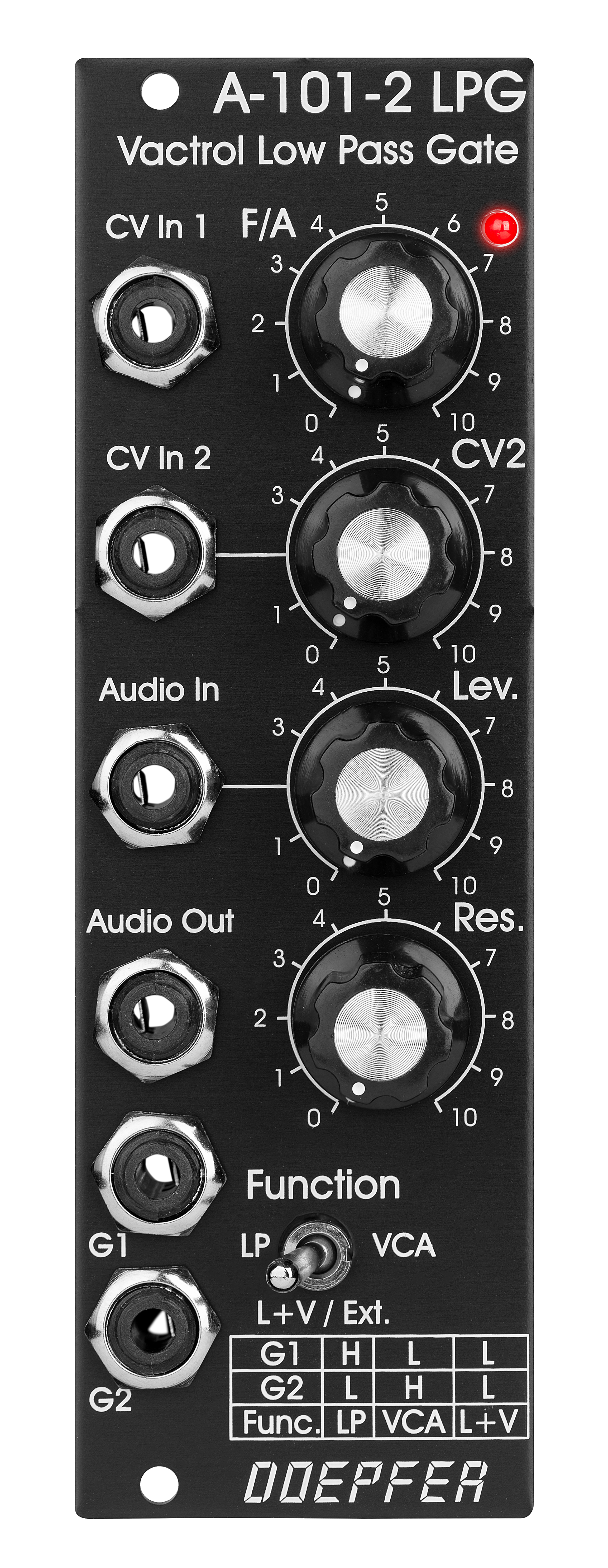 mit Abschwächern für die CV-Eingänge (Skalen-Beschriftung 0-10). Das