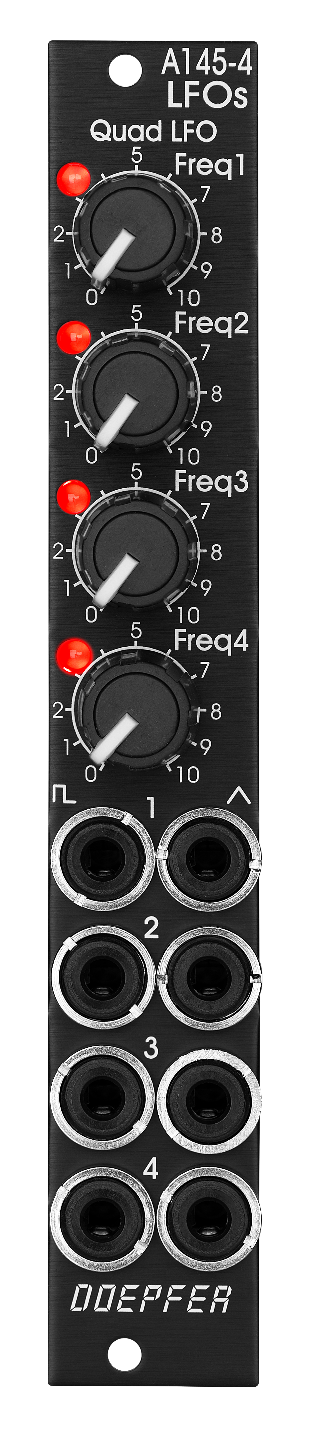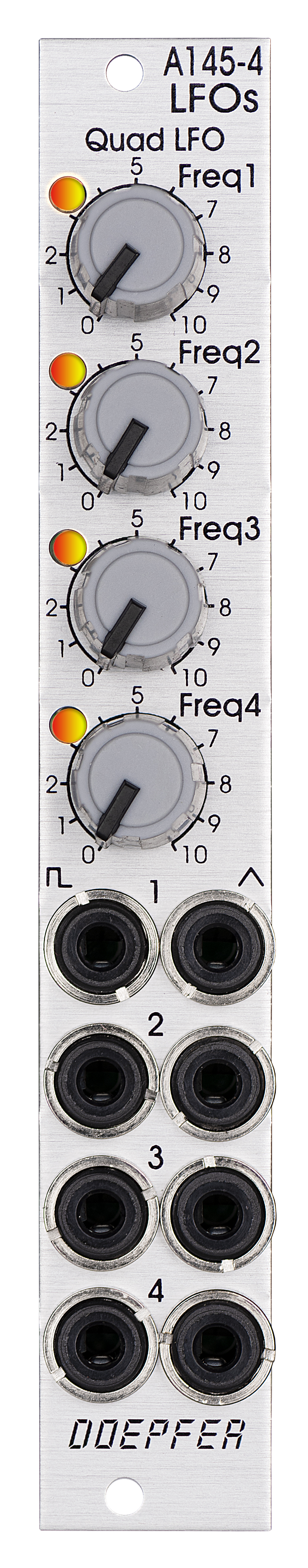 Module A-145-4 is a simple quad LFO (Low Frequency Oscillator). Not a very "exciting" module, just a bread-and-butter device and a simple demon for work. Virtually in every modular system several LFOs are required for modulation purposes. The module contains four simple LFOs with the waveforms triangle and rectangle. The output levels are about +/-5V (i.e. about 10Vpp). A dual color LED (red = positive / yellow = negative output voltage) indicates the triangle output of each LFO. The frequency range can be chosen for each LFO individually by means of a jumper between about 50 Hz ... 0,1 Hz (about 10 seconds, jumper removed) and about 2Hz ... 0,004 Hz (about 3-4 minutes, jumper installed). The module can be treated as a slimmed version of the quad LFO A-143-3 as it has similar features available. But the distances between the controls are smaller and rubberized small-sized knobs are used. In return the front panel has 4 HP only which is less than one third of the A-143-3. The module is primarily planned for applications where only limited space is available. The functional difference compared to the A-143-3 are the missing sawtooth outputs and frequency range switches. If more advanced features are required (e.g. additional waveforms, complex waveforms, waveform reset, adjustable waveforms, voltage controlled frequency and level) the modules A-143-1, A-143-3, A-143-4, A-145-1, A-146 and A-147-2 are available. The following document shows the positions and functions of the jumpers of the module: A145_4_jumpers.pdf |