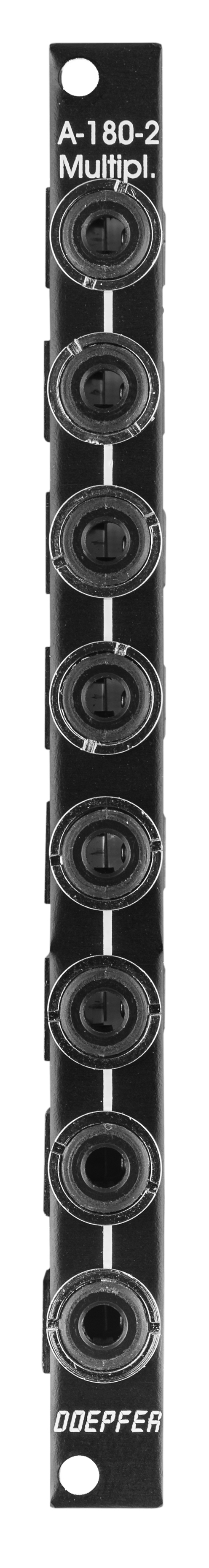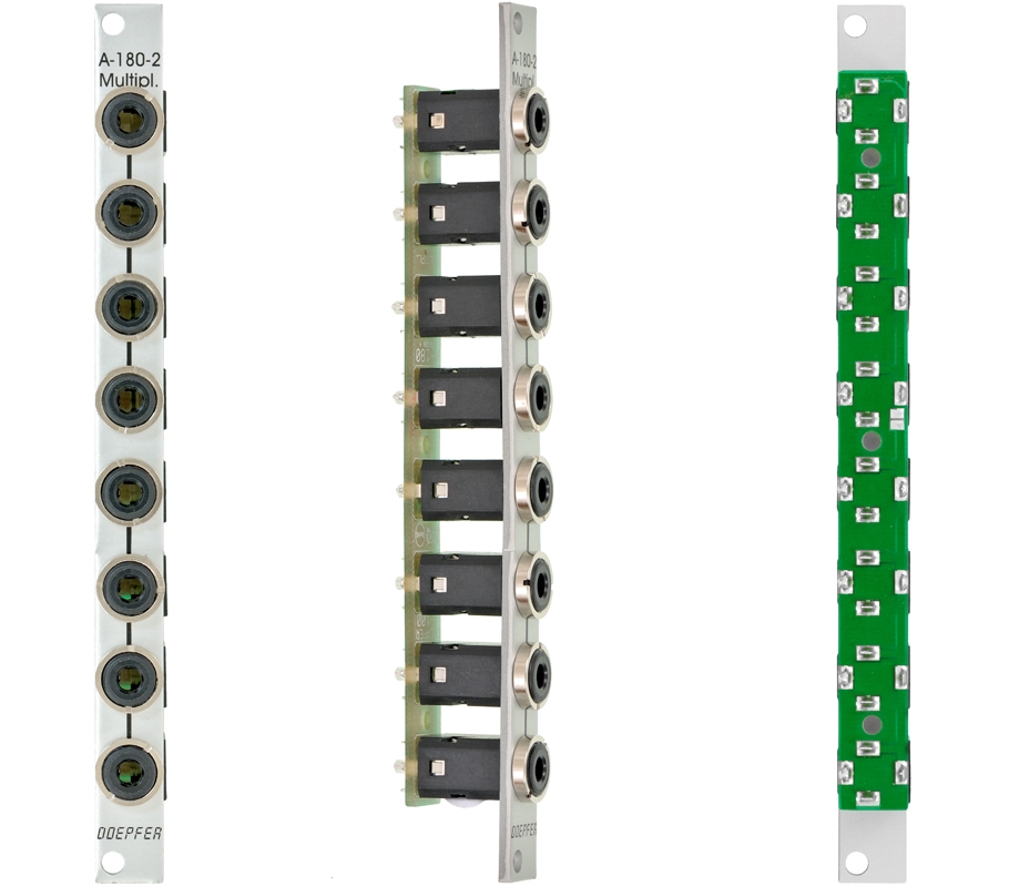 Modules A-180-1 and A-180-2 are simple multi-connectors. They have eight inter-connected sockets, so that you can "multiply" any audio or control signal. From the factory the modules come as two four-fold multiples. But they can be modified as an eight-fold multiple (solder bridge on the pcb). Though these modules are very "primitive" they are required very often in patches (e.g. to distribute a clock signal or a control voltage). Within a big A-100 system sufficient multiples should be planned. The function of A-180-1 and A-180-2 is the same. The modules differ only in the front panel width. For the distribution of control voltages used for pitch control of several VCOs the buffered multiple A-185-2 is recommended. This module has a built in buffer (and a lot of additional features like CV summing) that avoids small voltage losses that may be heard in pitch control applications. For more detailed information please look at the English user's guide: A180_man.pdf |