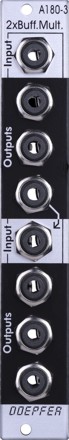 Module A-180-3 is a dual buffered 1-in-3 multiple. The signal applied to the input socket appears as a buffered signal at the three output sockets. Each output has it's own buffer, i.e. the three output sockets are not simply connected to each other. The lower output of the upper unit is normalled in the factory to the input of the lower unit. That way the module works as a single 1-in-6 buffered multiple provided that no signal is applied to the input of the lower unit. But it's also possible to pick-up the bus CV and normalize the input socket of the lower unit to the bus CV. Details in the document A180_3_jumper.pdf. Technical data: Typical applications