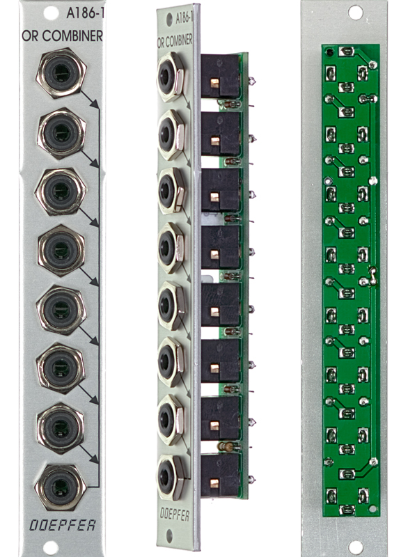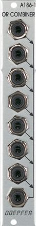 Module A-186-1 is a very simple, passive unit that combines up to 7 gate, trigger or analog signals by or-wiring. Function: