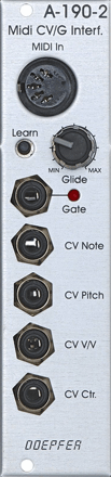 Das Modul A-190-2 ist eine preiswerte Alternative zum MIDI-CV/SYNC-Interface A-190-1 und kann immer dann eingesetzt werden, wenn die weitergehenden Eigenschaften des A-190 nicht benötigt werden (wie z.B. Clock-Ausgang, Start/Stop-Ausgang). A-190-2 ist die Modulversion des bewährten MCV4, wobei einige kleinere Änderungen speziell zur Anpassung an das A-100 vorgenommen wurden (z.B. fünf getrennte Mini-Klinkenbuchsen, separater null-symmetrischer CV-Ausgang für Pitch-Bend um die Pitchbendweite z.B. unter Verwendung des Präzisions-CV-Addierers A-185-2 einstellen zu können, Portamento-Funktion). Hier die wichtigsten Eigenschaften des A-190-2: