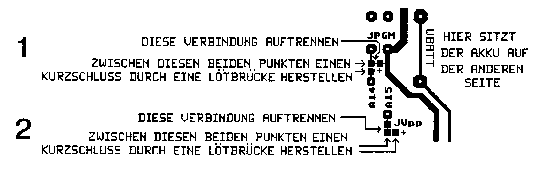 Falls für das Update ein EPROM vom Typ 27256 oder 27C256 geliefert wurde, so trennen Sie auf der Unterseite der Platine im Bereich von EPROM und Akku die beiden mit 1 und 2 im Bild unten markierten Verbindungen z.B. mit einem scharfen Messer auf und setzen Sie die beiden neuen Lötbrücken. Bei einem EPROM vom Typ 27512 oder 27C512 ist diese Änderung nur bei der Verbindung 1 vorzunehmen.