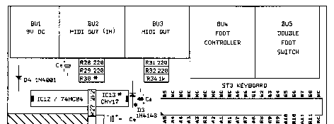 Beim Update von Software-Version 1.xx oder 2.xx auf 4.xx muss zusätzlich die MIDI OUT Buchse BU2 zu einem MIDI IN umgebaut werden. Der Umbau ist notwendig, um die Dump-Funktion nutzen zu können. Hierzu werden auf der Basisplatine die beiden Widerstände R28 und R29 entfernt (direkt unterhalb der MIDI OUT Buchse BU2 neben der Netzteilbuchse). Stattdessen werden die Bauteile R30 (Widerstand 220 Ohm), D3 (Diode 1N4148) und IC13 (Optokoppler CNY17II) eingebaut. Bei D3 und IC13 muss beim Einbau unbedingt die Polung beachtet werden. Das 6polige IC13 muss im vorgesehenen 8poligen Steckplatz so bestückt werden, dass die Markierung auf dem IC-Gehäuse (Kerbe oder Punkt) direkt über der entsprechenden Markierung des Bestückungsdrucks auf der Platine liegt. Zwischen IC13 und dem links daneben liegenden R27 (2k2) bleiben also 2 Bohrungen frei.