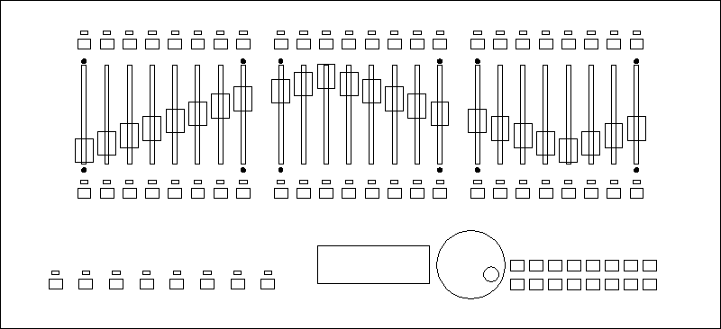 faders is no longer available as spare parts. The difference can be recognized at the mounting screws above and below the faders on the front panel. For the old version the mounting screws are located exactly above/below the first and last fader of each 8-fold fader group (-> front panel sketch old version). For the new version the mounting screws are located not exactly above below the faders but are a little bit displaced (-> front planel sketch new version). The knobs for the faders were manufactured by Re-An (order no. S773H09K) |