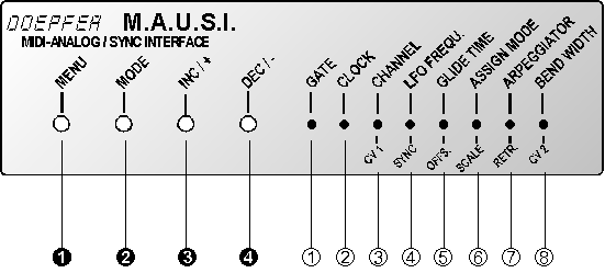 Nach dem Einschalten befindet sich MAUSI im Performance-Mode. Dies ist die normale Betriebsart, bei der alle eingehenden MIDI-Informationen gemäß der eingestellten Interface-Parameter in entsprechende CV-, Gate- und Clock-Signale gewandelt werden. Den Performance-Mode erkennen Sie daran, daß sämtliche Menü-LED's 3 bis 8 aus sind. Lediglich die Gate-LED 1 und die CLOCK-LED 2 leuchten bei entsprechenden MIDI-Aktivitäten auf: