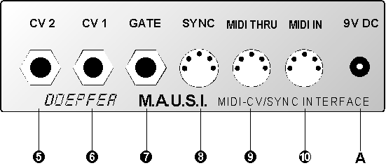 Bevor Sie MAUSI durch Verbinden mit dem Netzteil einschalten, sind zunächst die entsprechenden Verbindungen zwischen Ihrem MIDI-Gerät, MAUSI und dem analogen Synthesizer bzw. dem Gerät, das mit den SYNC-Signalen gesteuert werden soll, herzustellen.