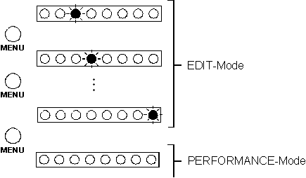 ! MENU-Taste : Umschalten in den EDIT-Mode, Anwahl eines Menüs zum Editieren, Umschalten in den PERFORMANCE-MODE
